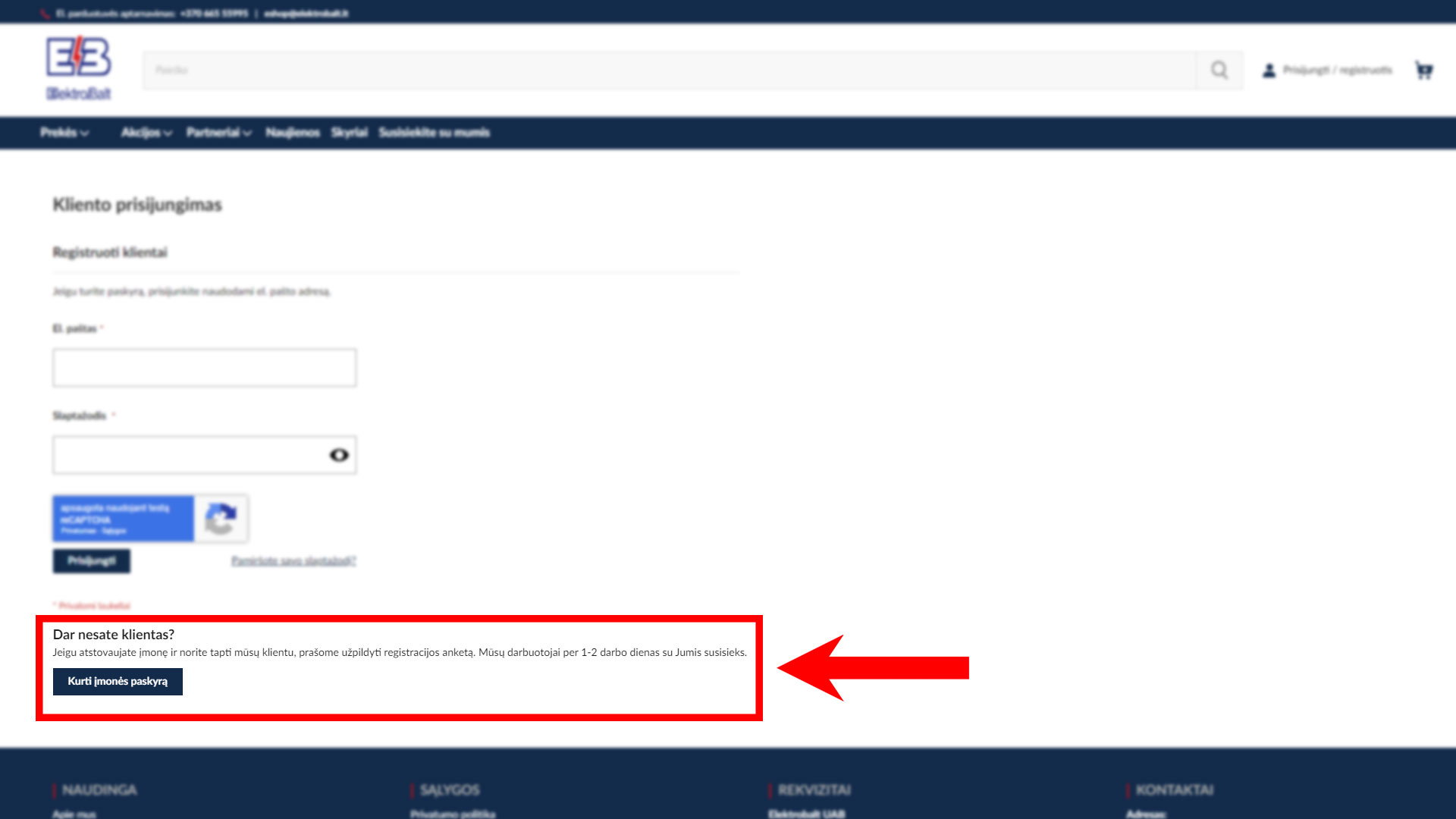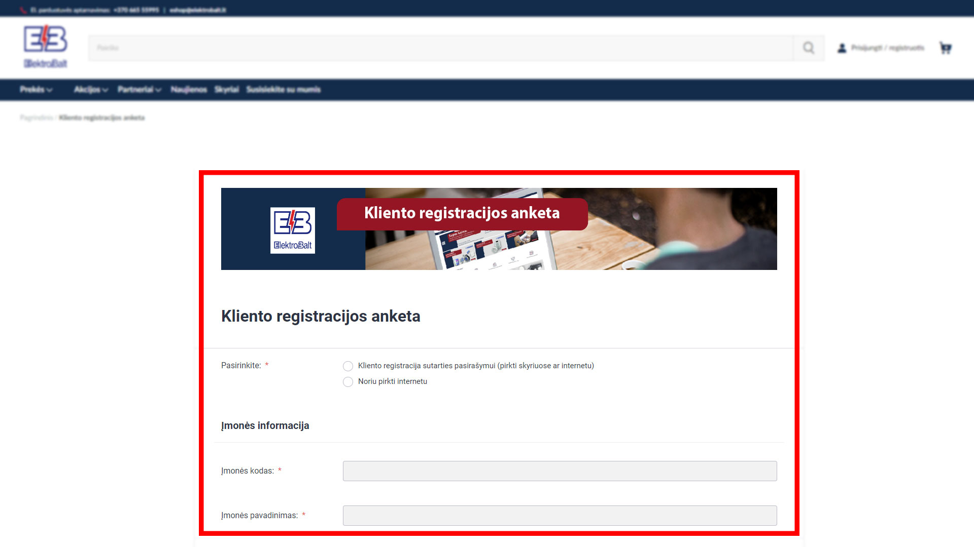 1. Naujiems klientams norintiems prisijungti ir pirkti bei naudotis Elektrobalt.lt sistema reikalinga užpildyti registracijos formą. Ją rasite atsidarę www.elektrobalt.lt ir dešiniame viršutiniame kampe paspaudę: Prisijungti/Registruotis.