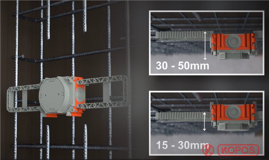 Svarbu pažymėti, kad liejamo betono instaliacinei dėžutei keliami didesni reikalavimai, sandarumo ir temperatūros bei cheminio atsparumo. Tarp KOPOS KOLÍN a.s. gaminių asortimento galite rasti dėžučių, pagamintų taikant progresyvią dvigubo įpurškimo technologiją su minkštais membraniniais įvadais. Klientas gali pasirinkti iš kelių tipų dėžučių, besigylinčių bei skirtingų formų ir diametrų dangčių. Visi variantai užtikrina aukštos kokybės darbą, paprastą naudojimą ir tarpusavio ryšį. Įbetonuotų dėžučių sistema taip pat siūlo tvirtinimo sparnus, skirtus tiesiogiai tvirtinti prie metalinio klojinio, arba stiprų sukibimo magnetą, kuris pritaikomas plieniniuose liejiniuose. Be to, atramos priešpriešiniam montavimui ir atramos lubų kabeliam, todėl kiekviena dėžutė gali būti pritaikyta šviestuvui. Žinoma, taip pat yra įvairių vamzdžių kabeliams, tinkamų lieti betonui.