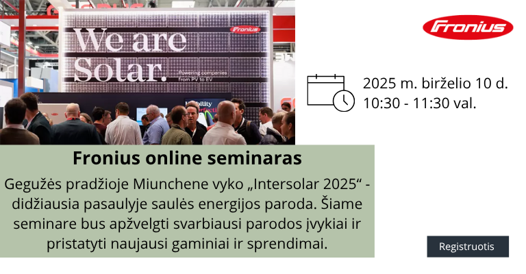 Gegužės pradžioje Miunchene vyko Intersolar 2025 - didžiausia pasaulyje saulės energetikos paroda. Šiame internetiniame seminare apžvelgiame svarbiausius parodos įvykius ir pristatysime savo naujausius gaminius ir sprendimus.