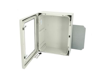 Spinta v/t [500x400x210] IP66 plastikinė su montažine plokšte tuščia ir stiklinėmis durimis 2 užraktų pilkos spalvos ARCA 504021W - FIBOX